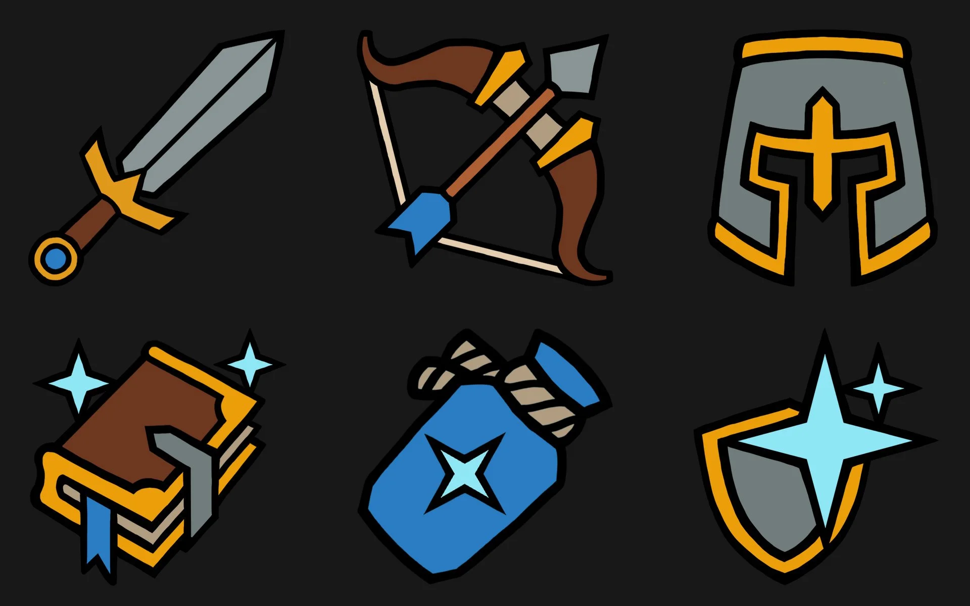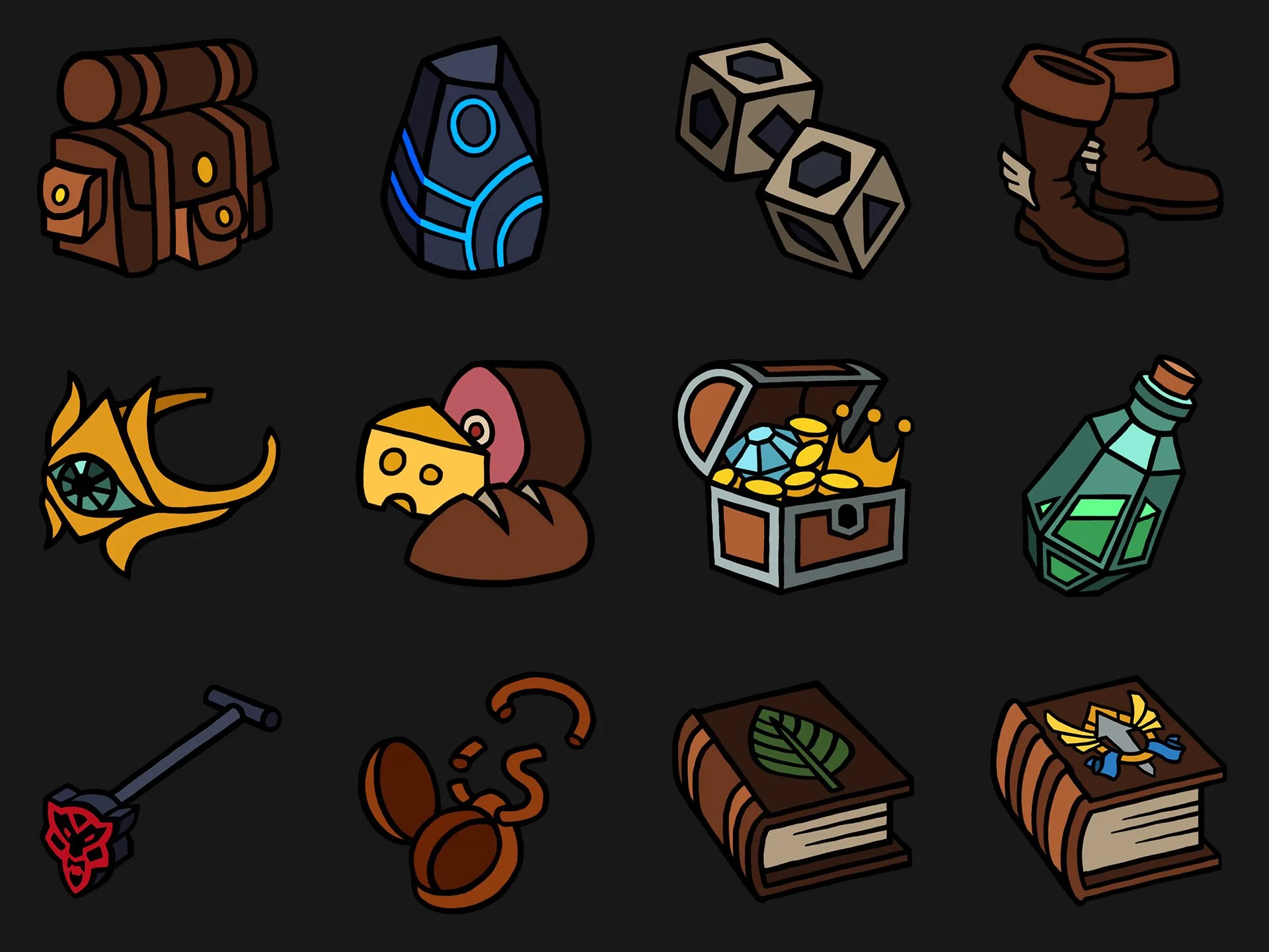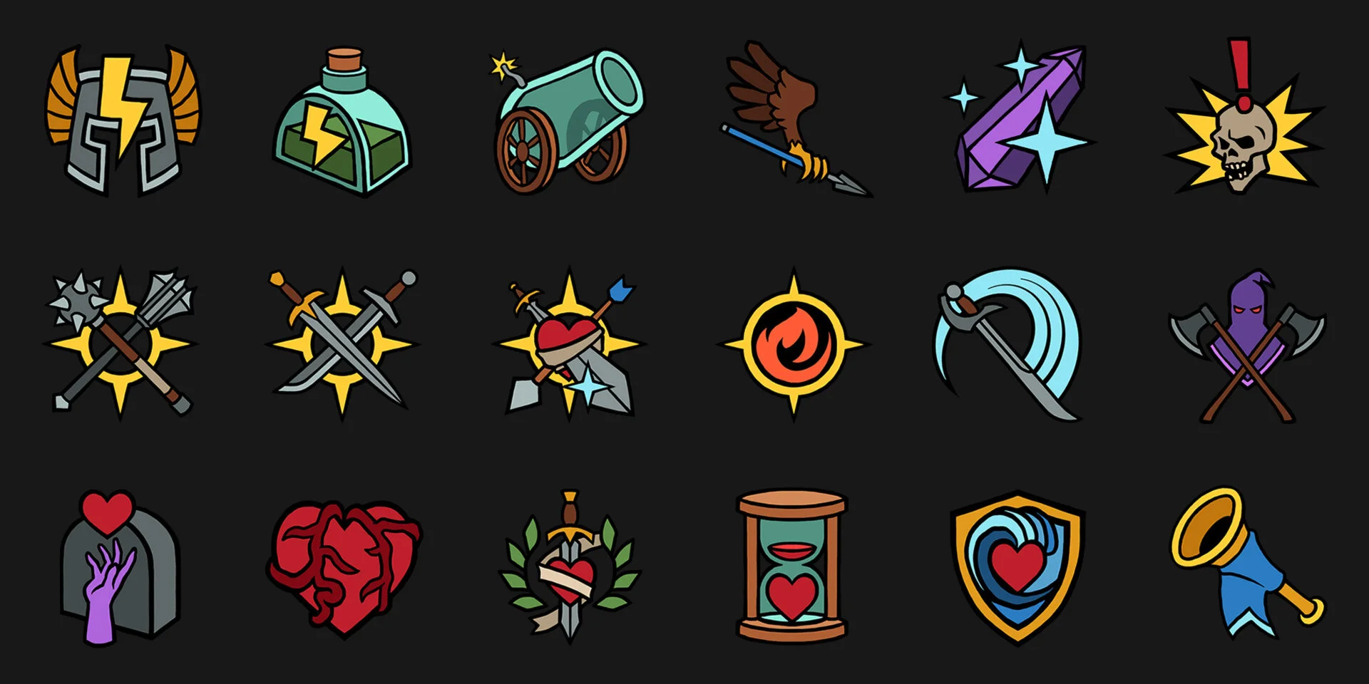 Icons used in the game follow a similar visual style as the character art, with solid color fills and black linework delineating shapes and planes. A hand-drawn appearance is desired, so while the linework needs to be clean and polished, some inconsistencies have been maintained.