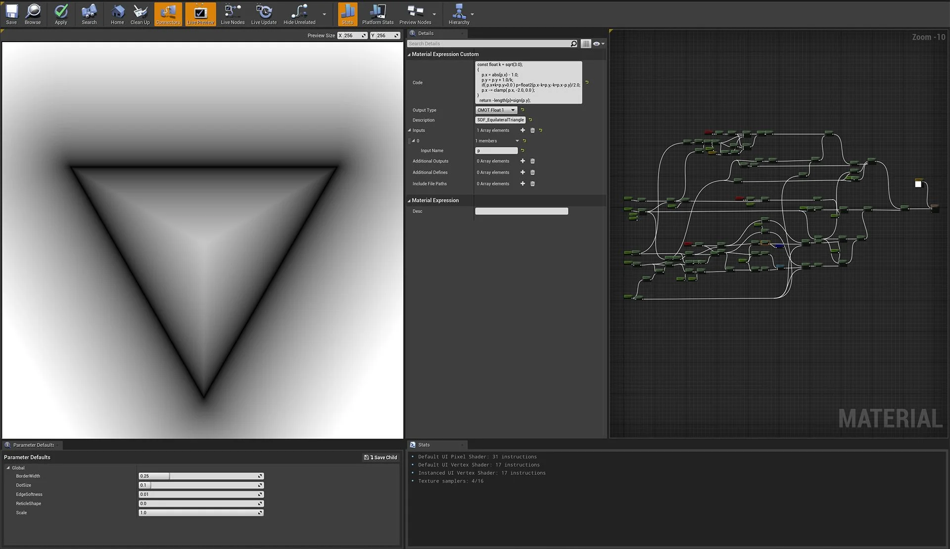 Signed Distance Fields (SDFs) for simple 2D primitives can be constructed using HLSL code within a pixel shader, offering resolution-independent scaling and morphological animation. This produces vector-like graphics whose shapes can easily be manipulated without sacrificing quality or fidelity. Inputs are parameterized, allowing any blueprint to control the predefined aspects of the reticle’s appearance.