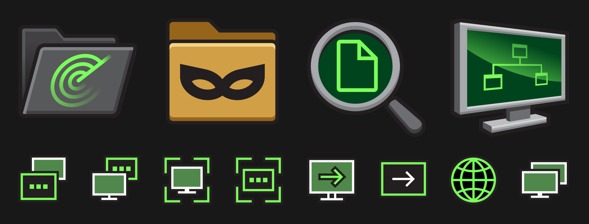 Complexity and level of detail in the icons is dictated by their final display size, as can be seen in the difference between the icons made for use on the desktop vs. the system tray. Maintaining a consistent design language and color palette helps to ensure cohesion between the icons regardless of their use case.