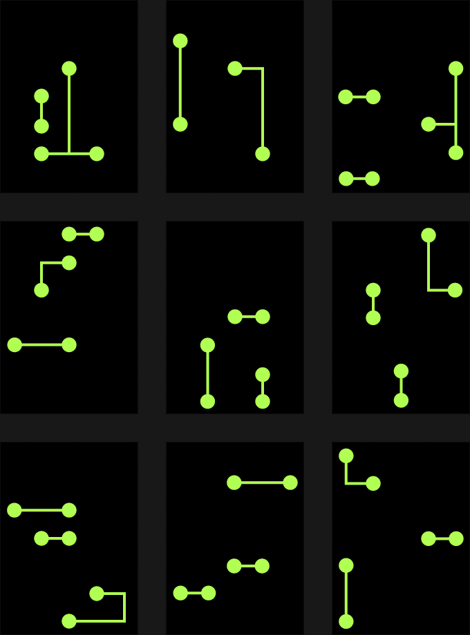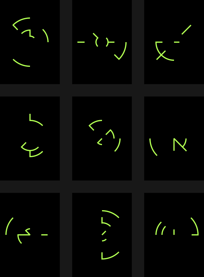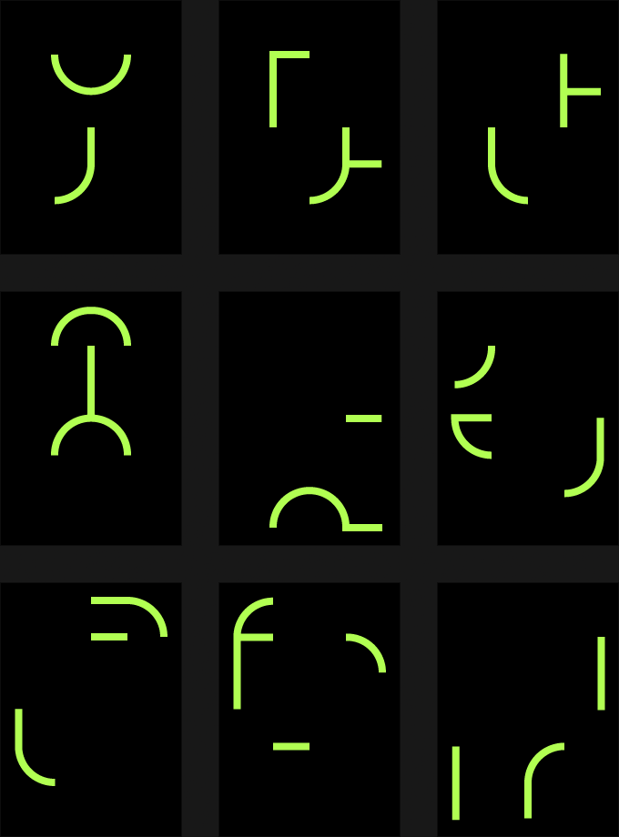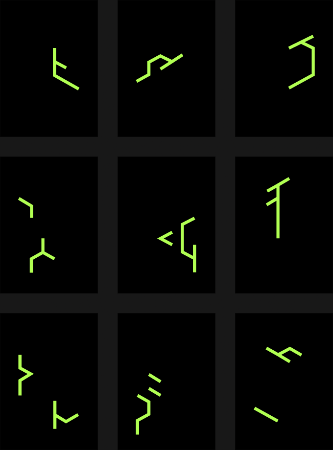 This minigame requires the player to select three fragments of a composite glyph in order to match the specified combination. Designs for variations on a set of 9 glyph fragments explored underlying grid construction, complexity, and ornamentation as means of distinguishing the sets from one another. Each fragment within a set needed to be unique from all other fragments.