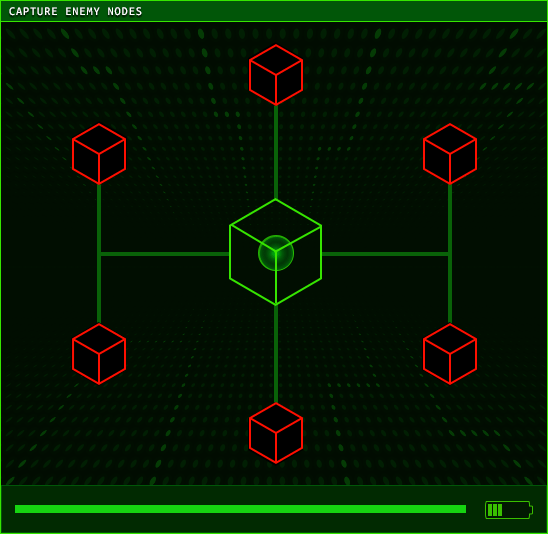 An in-game app for browsing, entering, and exploiting a network of virtual machines. A minimal, high-contrast topological map supports enumeration, targeted entry, and movement between compromised machines.